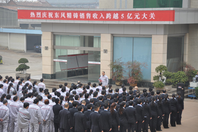 19日上午9時18分,公司在和鼎廣場舉行了銷售收入跨越五億元慶祝儀式。首先,杜孔明總經理致辭,熱烈祝賀東風精鑄銷售收入跨越五億元大關;隨后,公司銷售人員代表誓師,黨委書記孫長虹向銷售總部授予“邁向八億”戰旗;慶祝儀式上,與會員工在印有“倡導精益,打擊陋習” 倡議書的噴繪上簽字,表達堅決與陋習告別的決心。慶祝活動還進行了喜慶歡樂的拔河比賽。